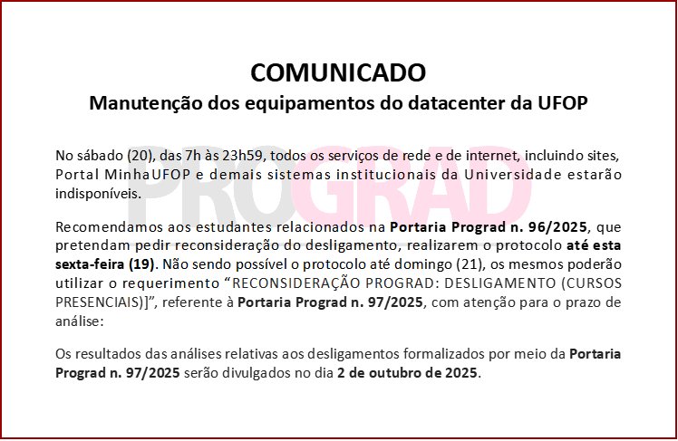 PORTARIA PROGRAD Nº 96, DE 12 DE SETEMBRO DE 2025 - Dispõe sobre o desligamento de discentes dos cursos presenciais de graduação da Universidade Federal de Ouro Preto, no segundo semestre letivo de 2025.
