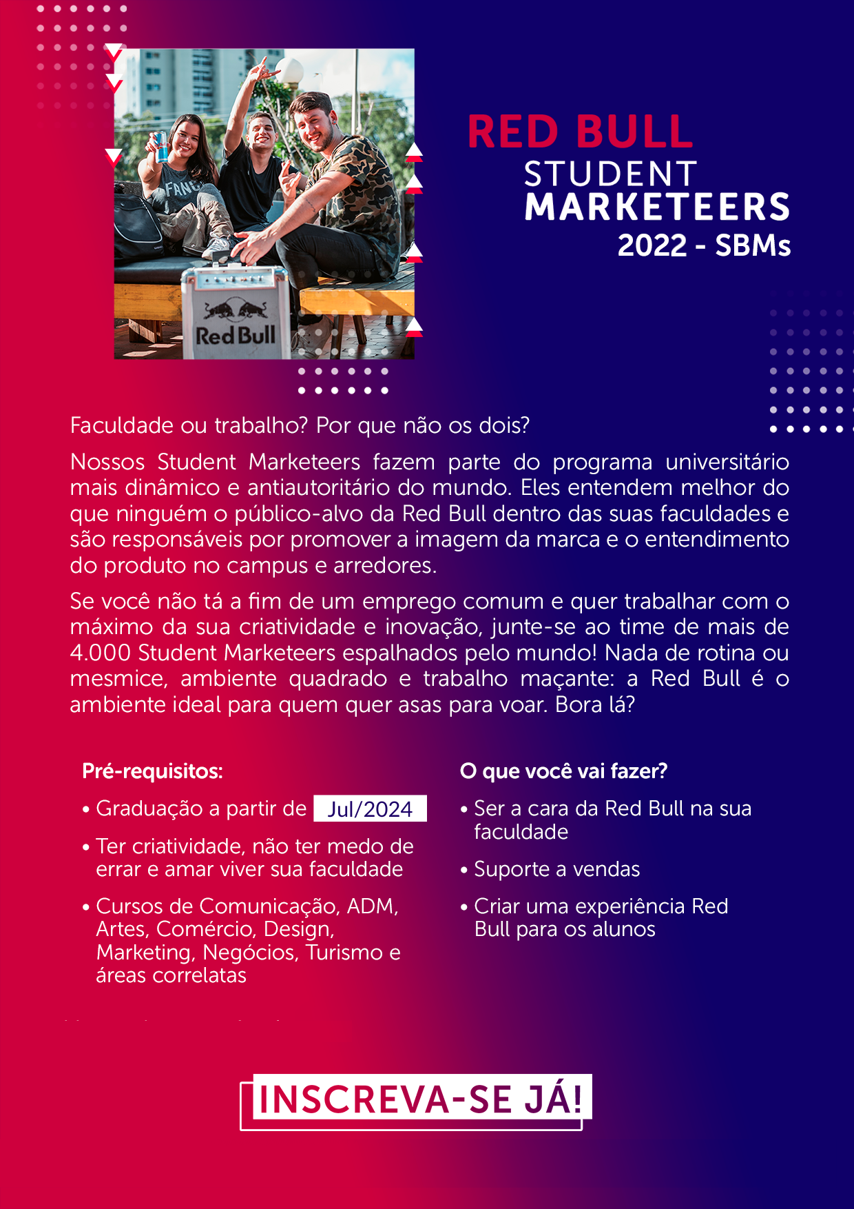 Os Student Marketeers entendem melhor do que ninguém as tendências e comportamentos do público jovem, e são responsáveis por promover a imagem da marca e o entendimento do produto dentro do mundo universitário. Isso inclui planejar ações com o time, ter contato direto com o consumidor, gerar experimentação do produto, e claro, trabalhar nos diversos eventos da Red Bull para garantir uma experiência inesquecível da marca para os nossos consumidores, tanto no meio físico, quanto digital. Se você quer fugir da mesmice e sonha em trabalhar com o máximo da sua criatividade e inovação, tá na hora de fazer sua inscrição!